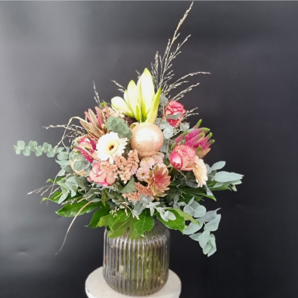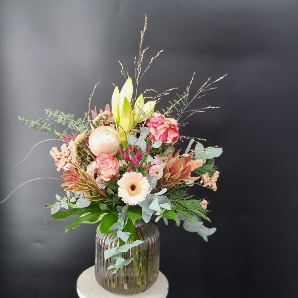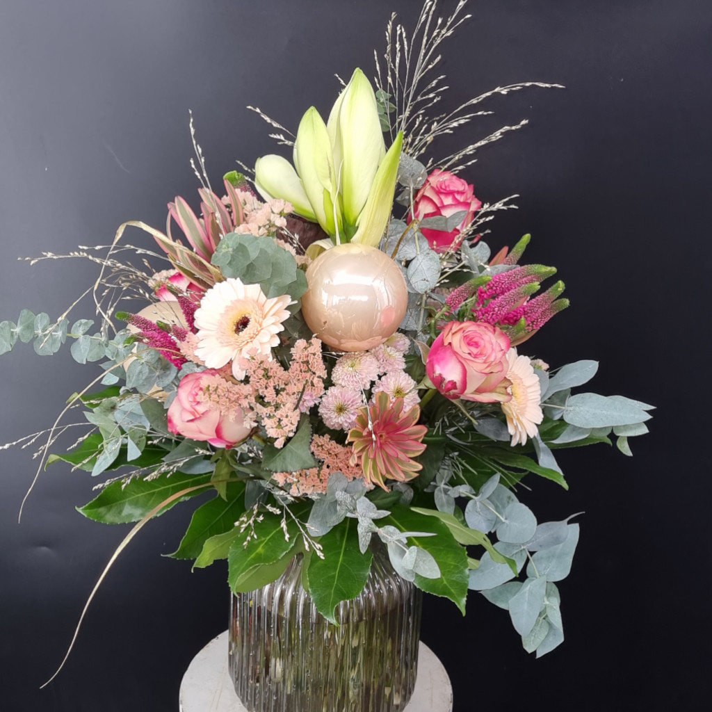 Alle Jahre wieder begleiten uns die klassischen Amaryllis durch die Advents-  und Weihnachtszeit und verkürzen uns das Warten auf das Fest. Hier ist eine weiße Amaryllis in Szene gesetzt mit pastellfarbenem Beiwerk wie Gerbera, Eukalyptus, zarten Gräsern und Deko. Der hier abgebildete Strauß hat die Größe XL.