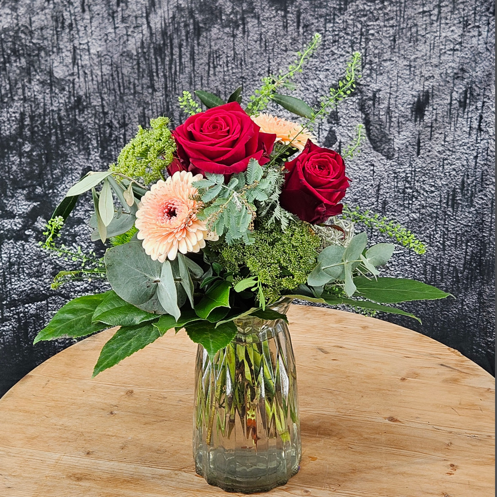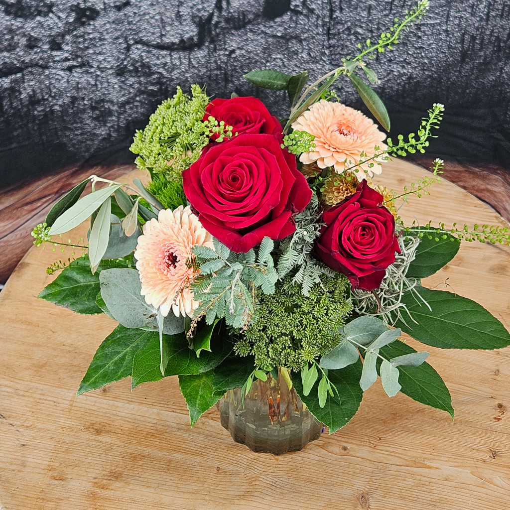 Dieser kurze und kompakte Strauß ist dezent und kraftvoll zugleich. Eine Botschaft für die Liebe. Rote Rosen in Verbindung mit apricot farbenem Beiwerk. Der hier abgebildete Strauß hat die Größe L.