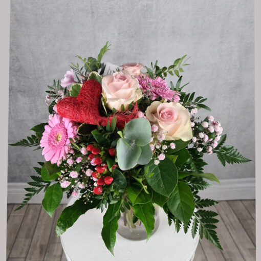 Liebevoll gebundener Strauß in rosé-pink Farbtönen. Mit Rosen und passendem Beiwerk. In leuchtendem Rosé-pink. Mit Herz-Deko. Die Rosenfarbe ist, wenn nicht anders gewünscht, immer rosé oder pink. Der hier abgebildete Strauß ist Größe M.