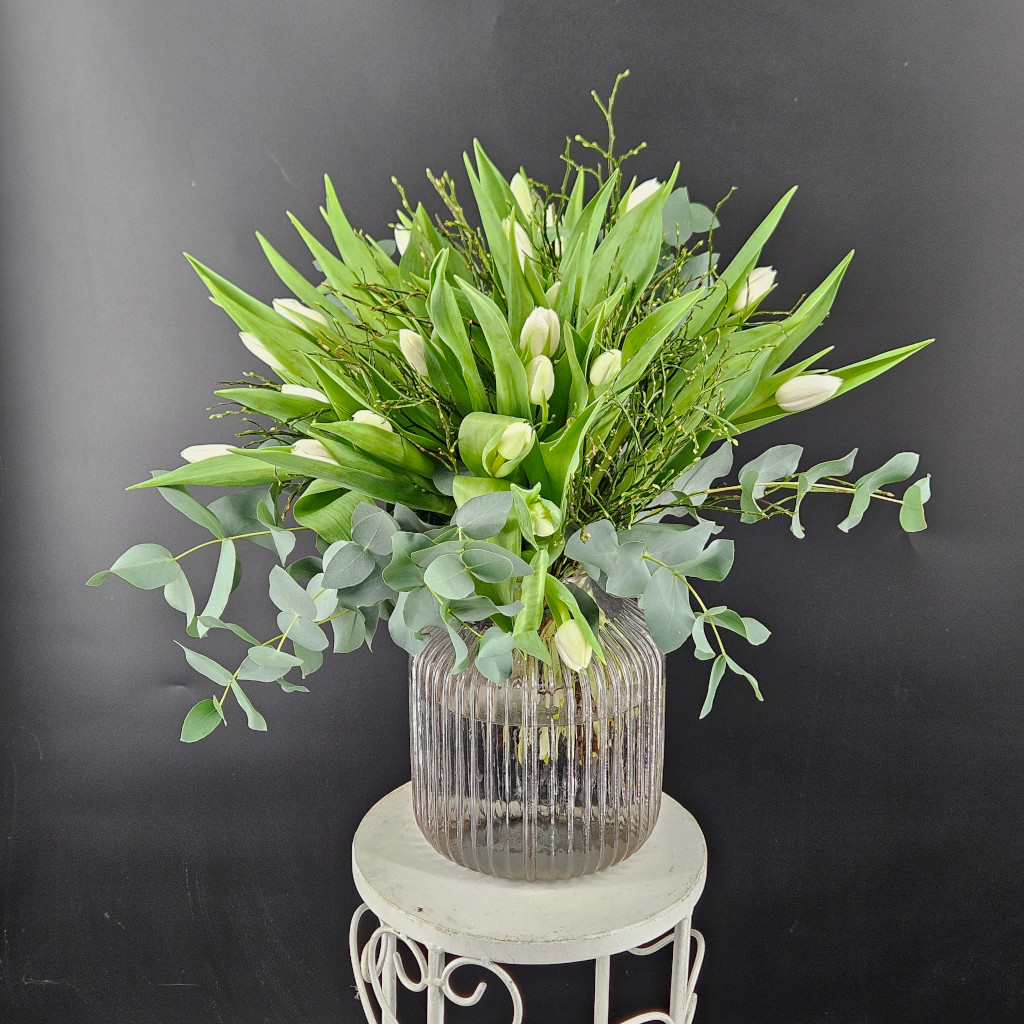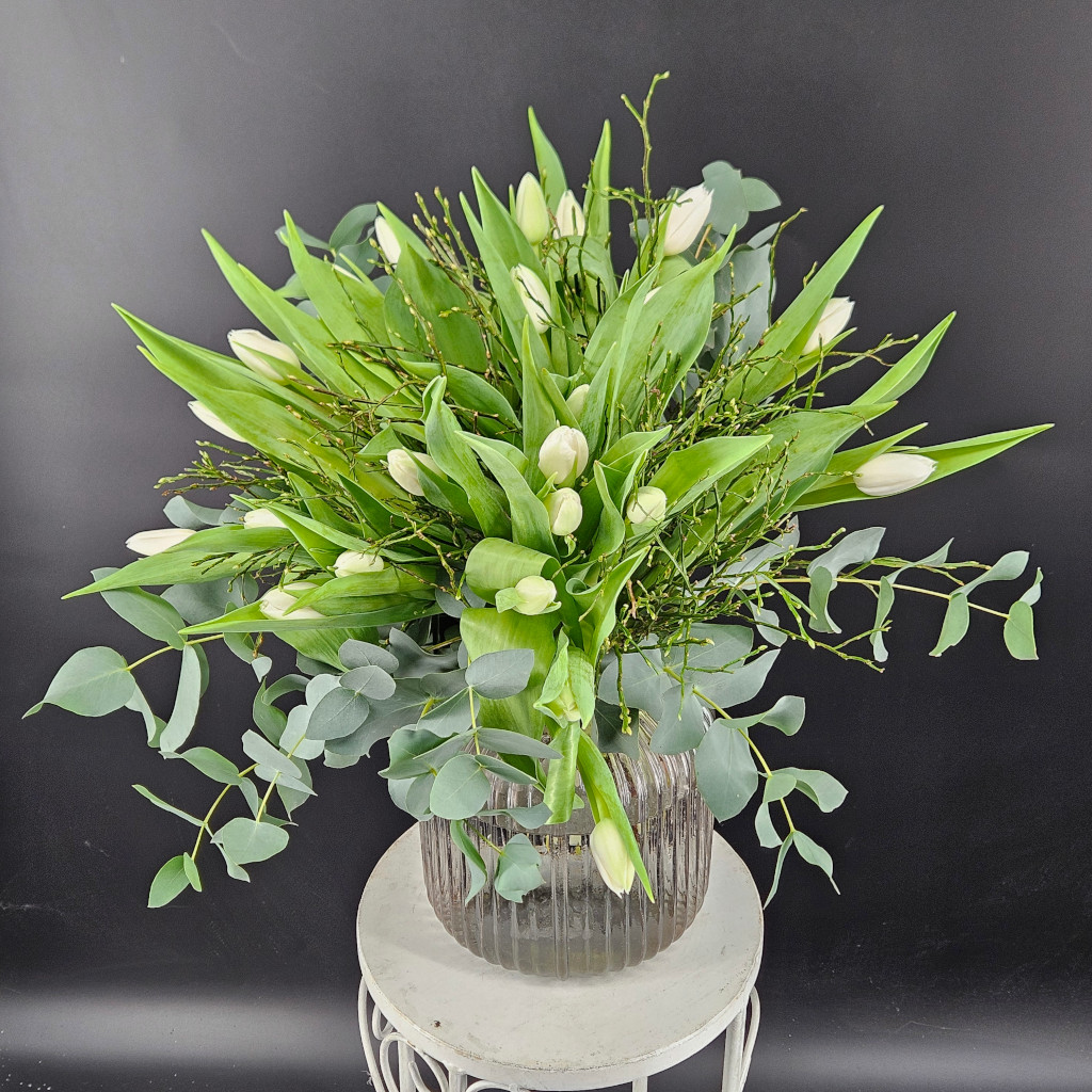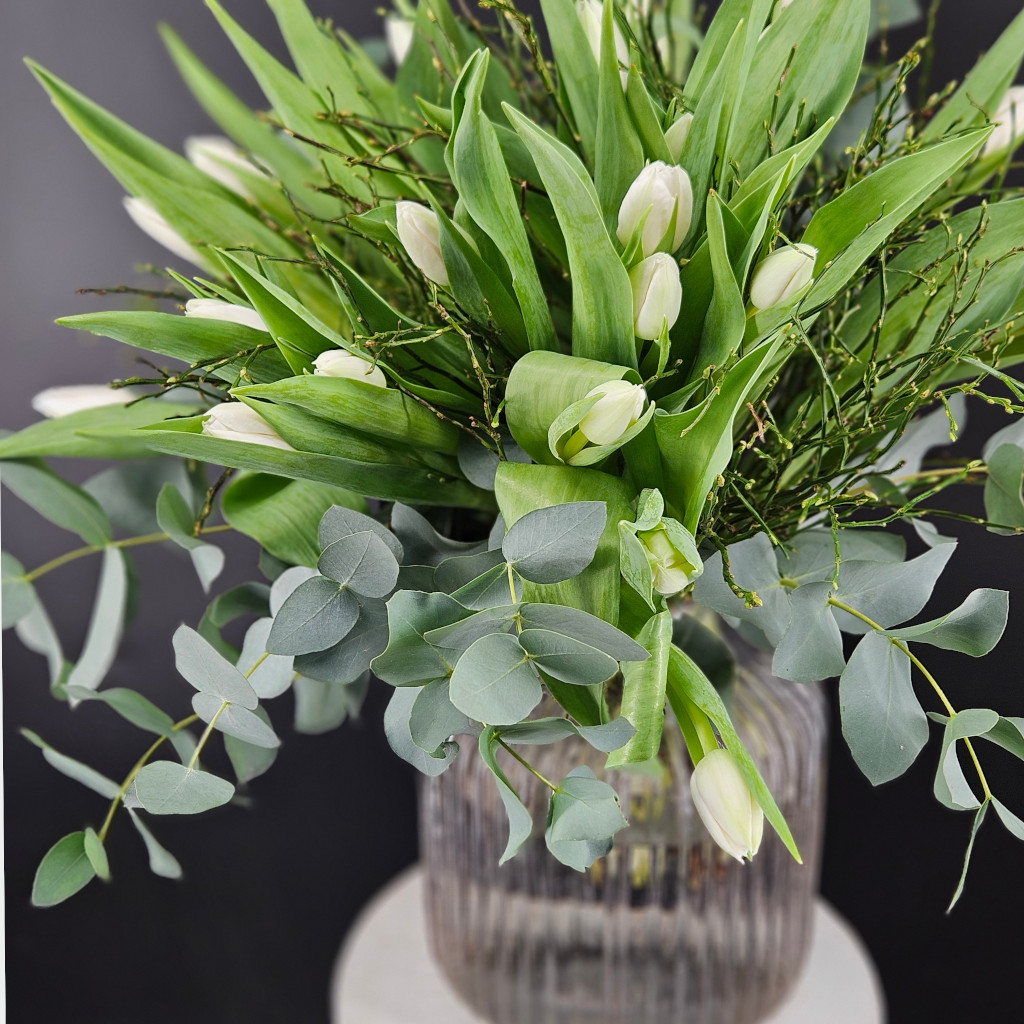 Tulpen pur! Was gibt es Schöneres im Frühling? Hier in reinweiß, aufgebunden mit Heidelbeere und Eukalyptus. Die Farbauswahl ist individuell, standardmäßig liefern wir weiße Tulpen. Bunt geht natürlich auch. Einfach den Farbwunsch am Ende notieren. Dieser Strauß hat die Größe XL.