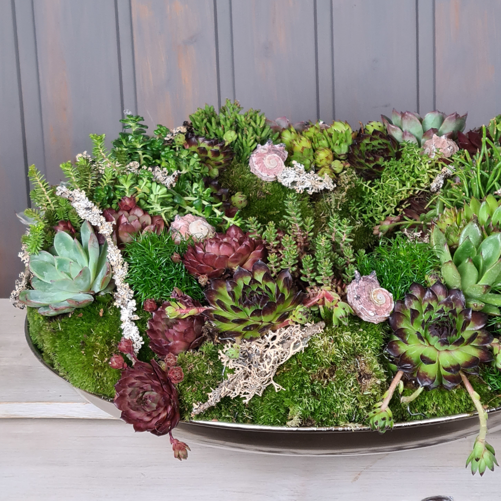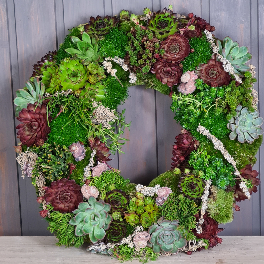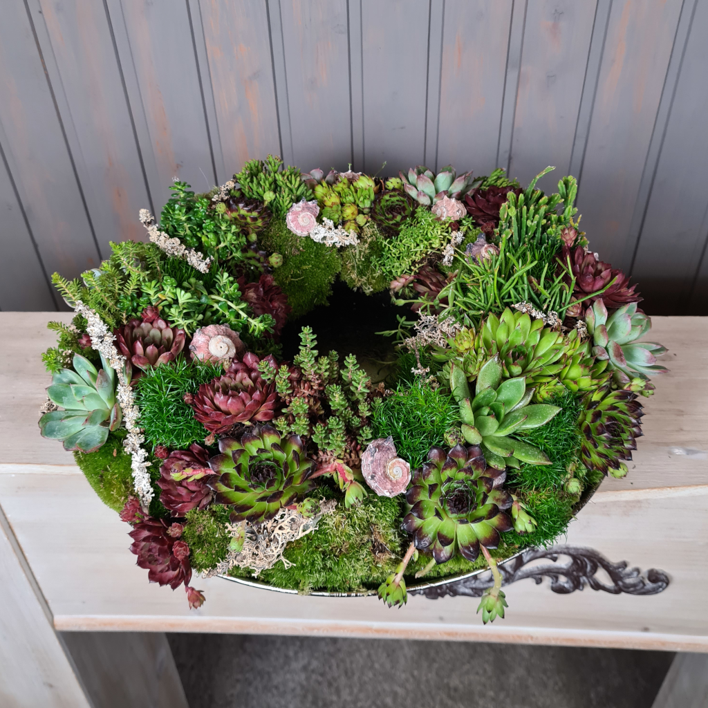 Unser Werkstück des Monats Juni 2023. Entwickelt und umgesetzt von Sabrina. Dieser mit Echeverien, Sternmoos und Sempervivum gearbeitete Kranz ziert sowohl als Türkranz jede Tür als auch als Tischkranz den Tisch. Eine wunderbare Derkoration mit Windlicht für die Gartenparty oder den Wohnzimmertisch.