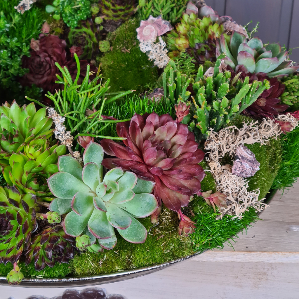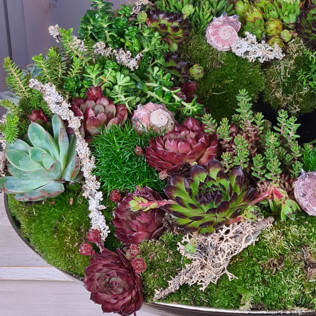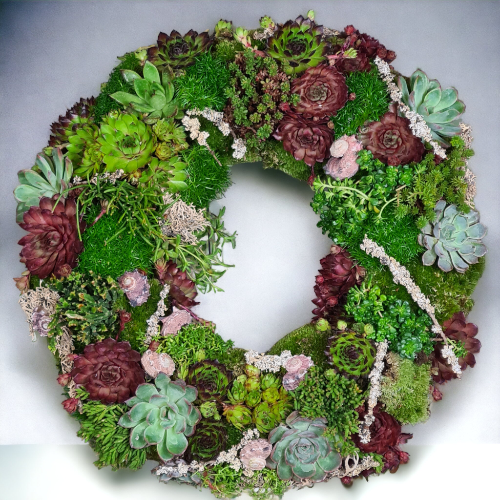 Unser Werkstück des Monats Juni 2023. Entwickelt und umgesetzt von Sabrina. Dieser mit Echeverien, Sternmoos und Sempervivum gearbeitete Kranz ziert sowohl als Türkranz jede Tür als auch als Tischkranz den Tisch. Eine wunderbare Derkoration mit Windlicht für die Gartenparty oder den Wohnzimmertisch.