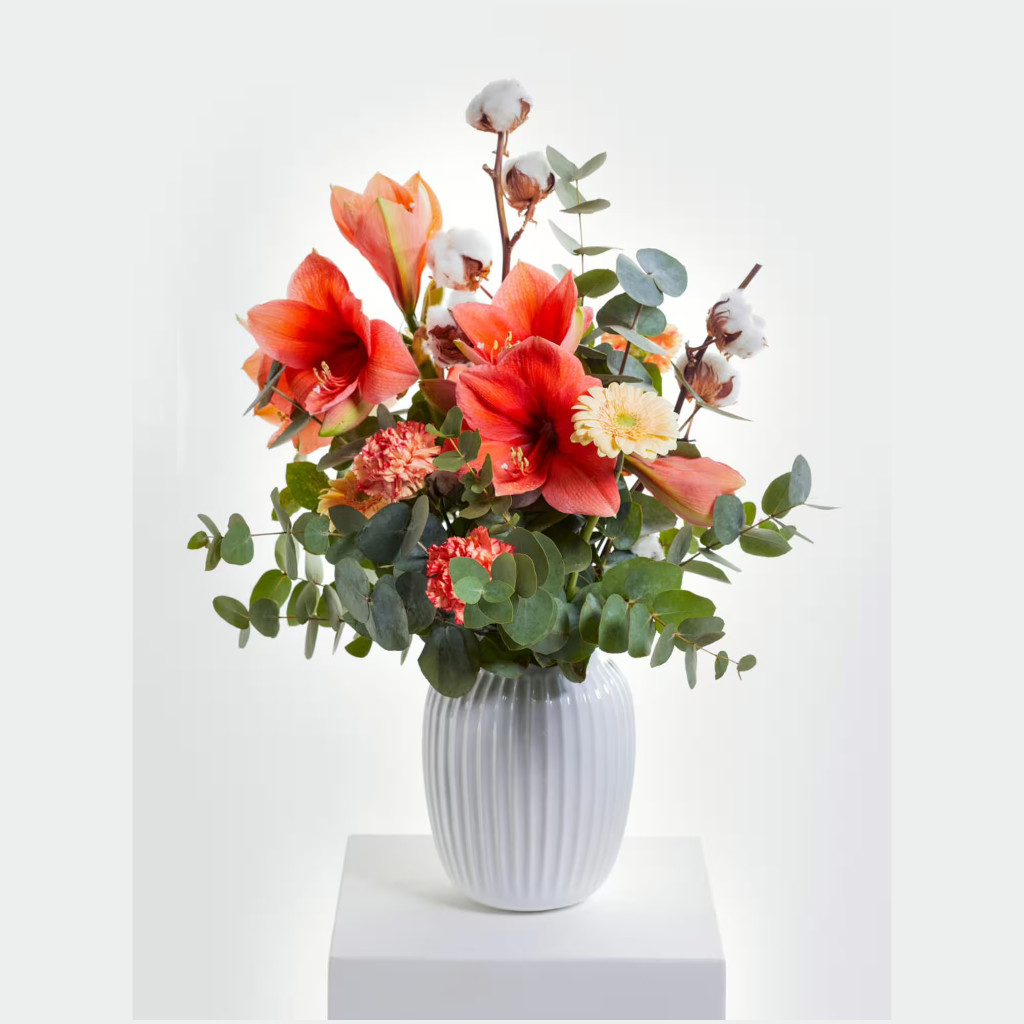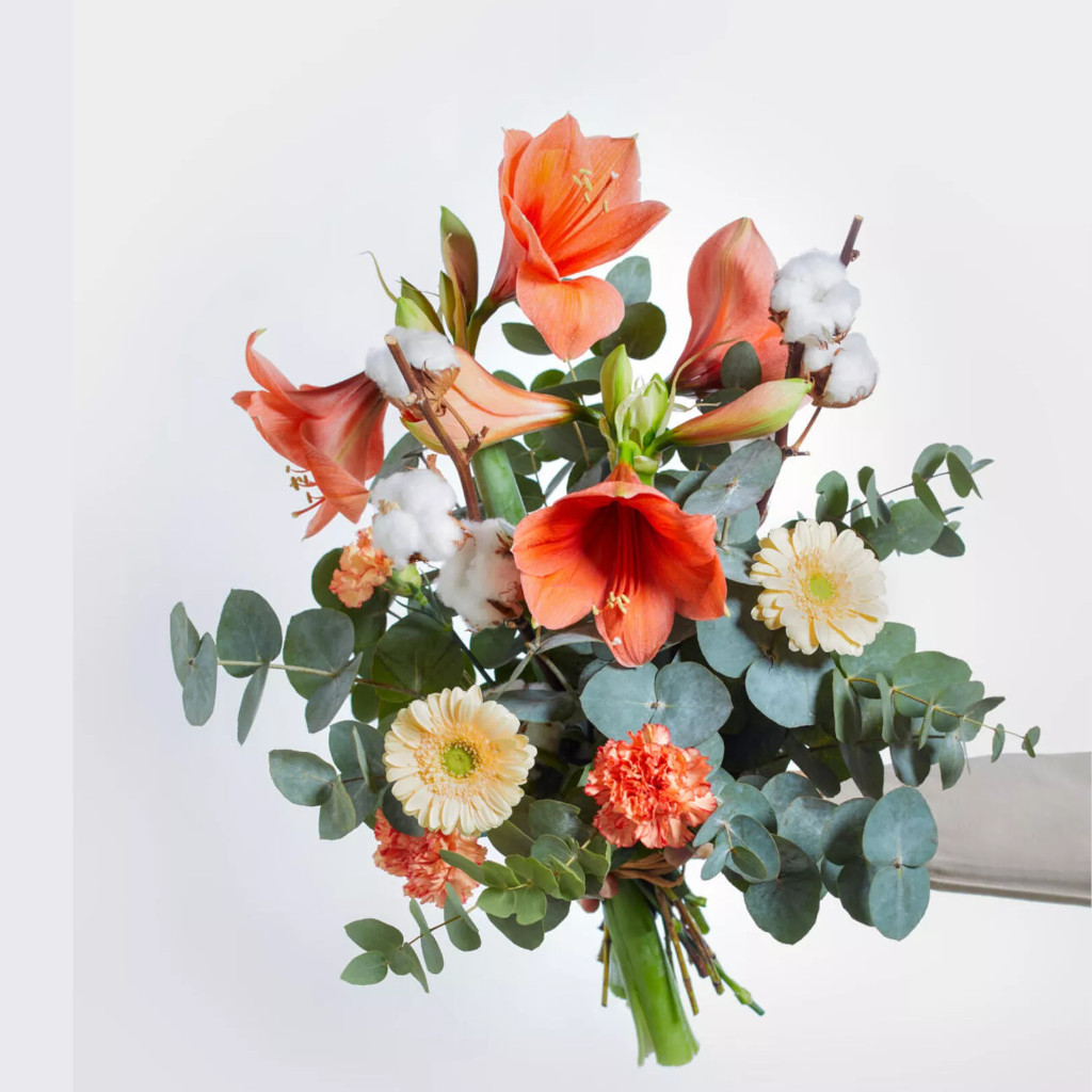 Gestaffelt gebundener Strauß in Apricot mit Amaryllis, Germini und Nelken sowie Baumwolle als Accessoires. Als Beiwerk wird Eukalyptus verwendet. Bei geschlossenen Amaryllis kann das vollständige Aufblühen bis zu 2-4 Tagen dauern.